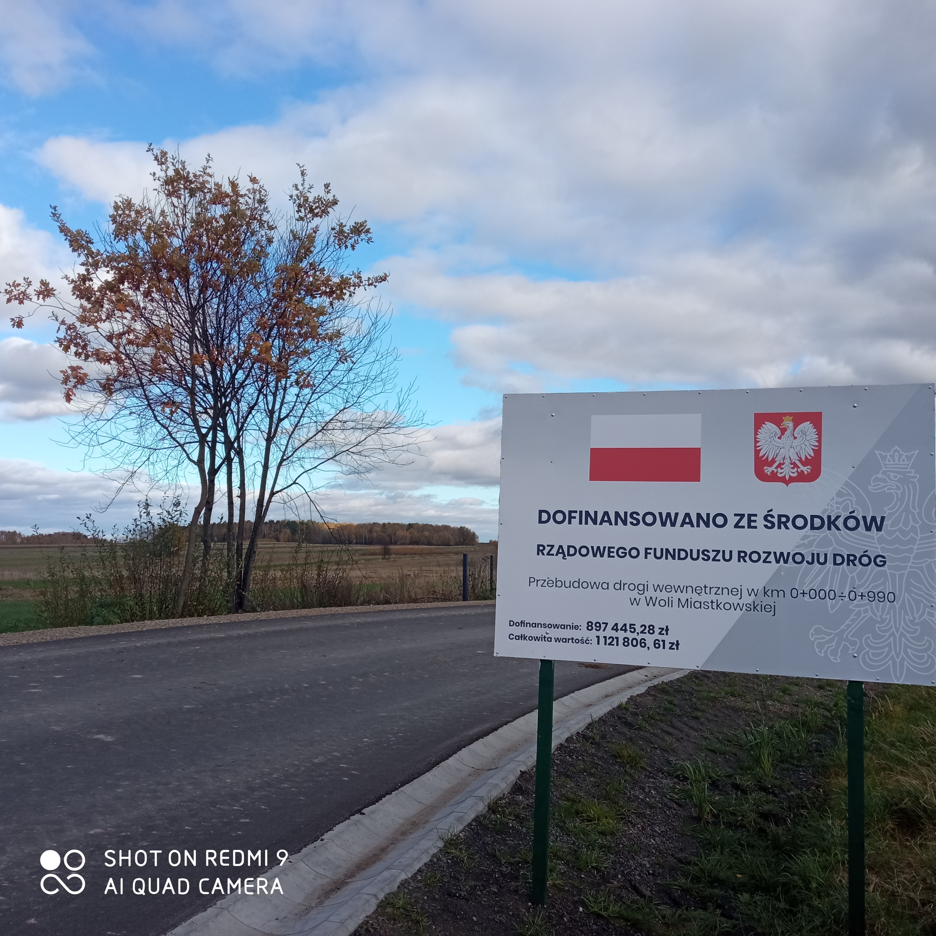 Zadanie realizowane w oparciu o Umowę Nr RFRD/20/2023 dotacji z dnia 24 lipca 2023r. ze środków finansowych Rządowego Funduszu Rozwoju Dróg na zadanie „Przebudowa drogi wewnętrznej w km 0+000-0+990 w Woli Miastkowskiej”.